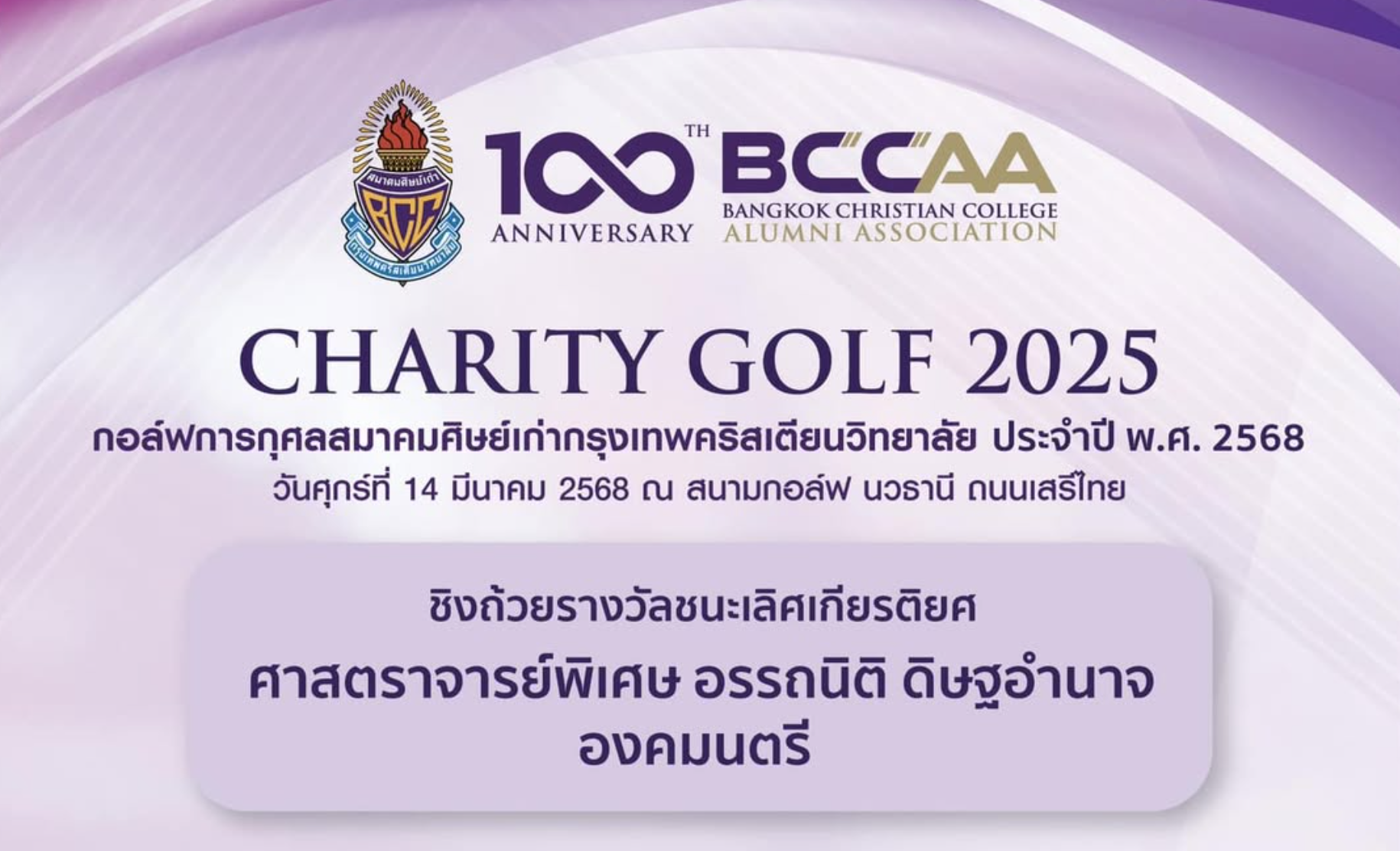 สมาคมศิษย์เก่ากรุงเทพคริสเตียนวิทยาลัย วาระปี 2566-2568 ได้จัดแข่งกอล์ฟการกุศล ประจำปี 2568 เนื่องในโอกาสครบรอบ 100 ปี ของสมาคมศิษย์เก่าฯ ตามวัตถุประสงค์เพื่อหารายได้สนับสนุนกิจการของสมาคมฯ และสมทบกองทุนป๋าอารีย์ เพื่อครู บีซีซี ในวันศุกร์ที่ 14 มีนาคม 2568 ณ สนามกอล์ฟ นวธานี ถนนเสรีไทย ชิงถ้วยรางวัลเกียรติยศ ศาสตราจารย์พิเศษ อรรถนิติ ดิษฐอำนาจ องคมนตรี สมาคมศิษย์เก่ากรุงเทพคริสเตียนฯ จึงขอเรียนเชิญศิษย์เก่านักกอล์ฟม่วงทองทุกคน, ทุกรุ่น และองค์ใดๆ ที่ต้องการสนับสนุนกิจกรรมกอล์ฟการกุศล ครั้งนี้ ด้วยการสมัครร่วมการแข่งกอล์ฟ หรือสนับสนุนด้านอื่นๆ สามารถติดต่อผ่านสำนักงานสมาคมฯ หรือสแกน QR Code เพื่อสอบถามและสมัครร่วมแข่งขัน กรณีที่การสมัครขององค์กรใดๆ ต้องการหนังสือเชิญ จากสมาคมศิษย์เก่าฯ กรุณาแจ้ง เพื่อดำเนินการได้