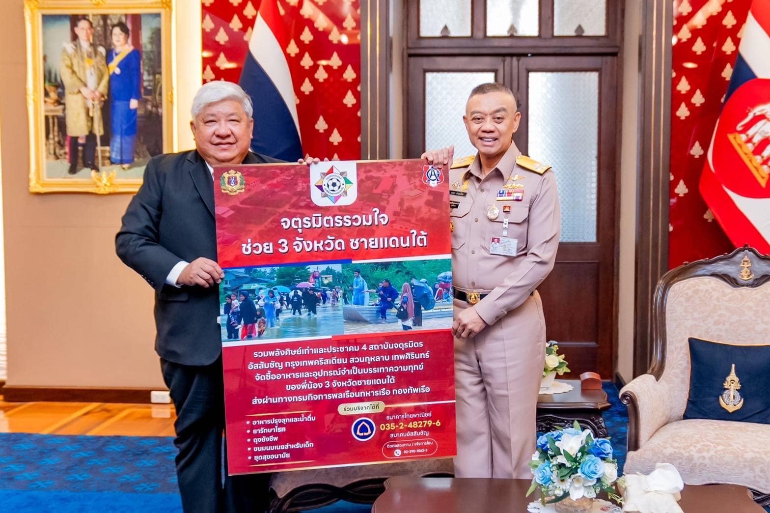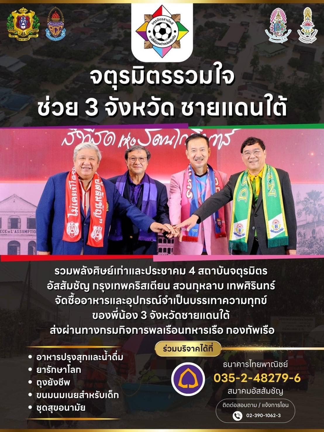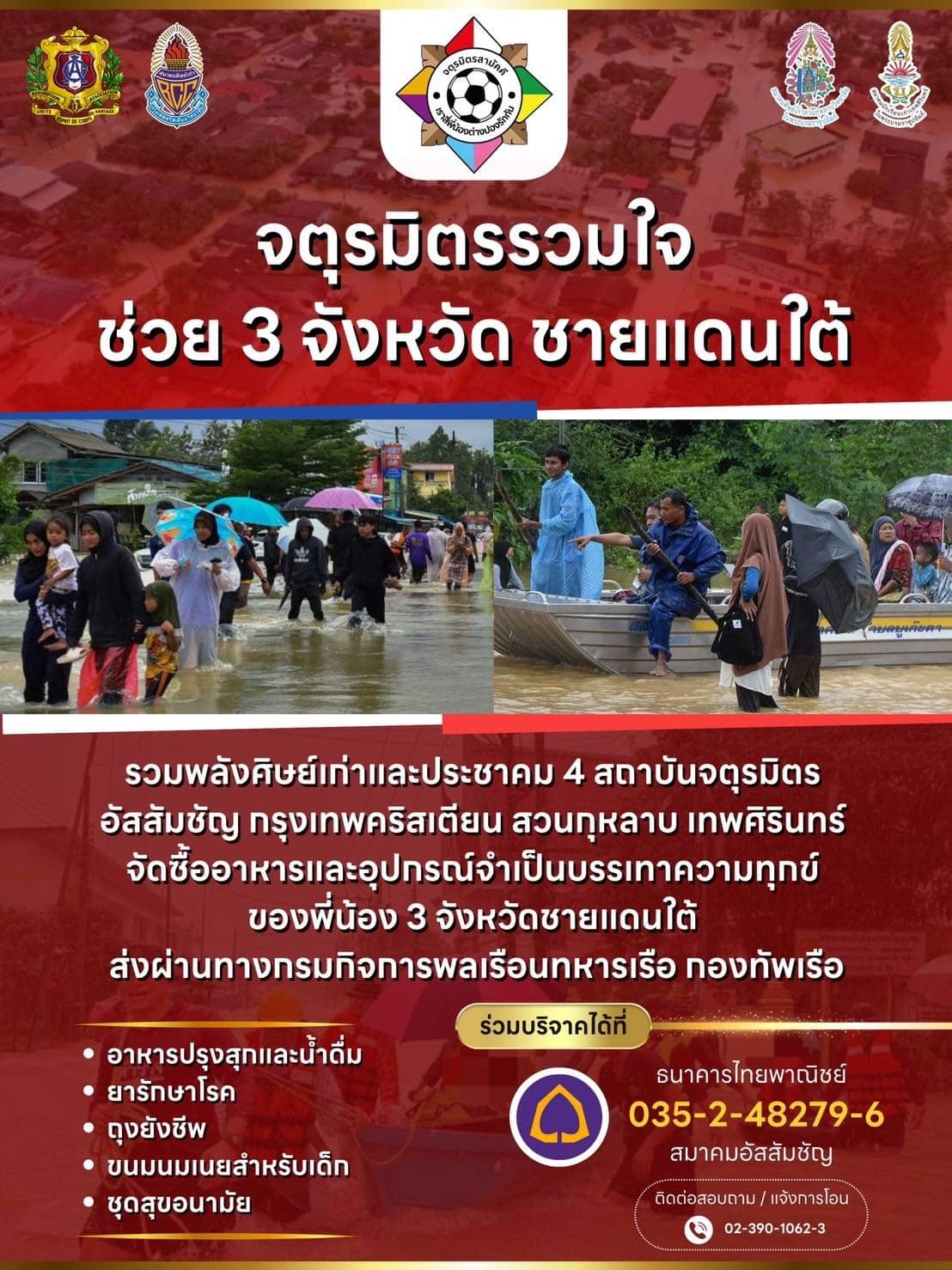 ร่วมกันจัดซื้ออาหาร และอุปกรณ์ จำเป็นบรรเทาความทุกข์ ของพี่น้อง 3 จังหวัดชายแดนใต้ โดยส่งมอบให้กองทัพเรือไปยังหน่วยเฉพาะกิจนาวิกโยธินภาคใต้/ กรมทหารราบที่ 3 กองพลนาวิกโยธิน ค่ายจุฬาภรณ์ เพื่อเเจกจ่ายประชาชนที่ได้รับอุทกภัยในจังหวัดนราธิวาส ร่วมบริจาคได้ที่ สมาคมอัสสัมชัญ ธนาคารไทยพาณิชย์ 035-2-48279-6